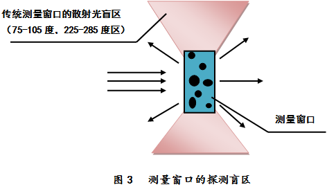 無論是何種設(shè)計(jì)的激光粒度儀,都存在一個(gè)測量窗口,樣品在窗口中充分分散,被激光照射,產(chǎn)生散射光。如圖3所示,傳統(tǒng)測量窗口由于機(jī)械結(jié)構(gòu)和光學(xué)玻璃存在全反射,總是存在一個(gè)散射光探測盲區(qū)。這個(gè)盲區(qū)大致分布在75-105度、255-285度區(qū)域內(nèi)。