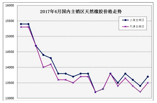 以下為4月國(guó)內(nèi)主銷區(qū)天然橡膠價(jià)格走勢(shì):