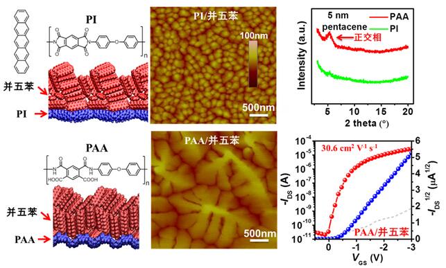 圖3 并五苯在PI和PAA表面的生長方式、薄膜形貌、結(jié)晶性以及電學(xué)性質(zhì)
