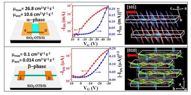 有機(jī)分子大多是通過極弱的范德華力相互作用而形成晶體,因此多晶相是有機(jī)半導(dǎo)體材料中非常普遍的一種現(xiàn)象。不同堆積結(jié)構(gòu)的晶相具有不同的電子耦合作用,從而導(dǎo)致不同的電荷傳輸行為。如何可控組裝生長高遷移率的晶相一直以來都是分子電子學(xué)中一個極具有挑戰(zhàn)性的課題,涉及到分子結(jié)構(gòu)、晶體工程和超分子自組裝等多方面的內(nèi)容。