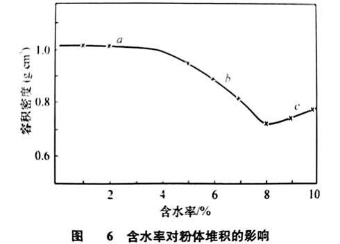 實(shí)際顆粒與理想顆粒的表面性質(zhì)不同,實(shí)際顆粒(特別是小顆粒有一定的吸濕性,也會(huì)帶有表面電荷。因此,對(duì)于實(shí)際顆粒來(lái)說(shuō),顆粒越小,堆積過(guò)程中顆粒間的黏聚作用越強(qiáng),其孔隙率會(huì)變大,此現(xiàn)象與理想狀態(tài)下顆粒尺寸和孔隙率無(wú)關(guān)的說(shuō)法矛盾,所以潮濕粉體的表觀體積會(huì)隨含水量的增加而變大。